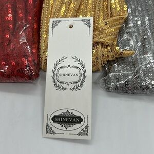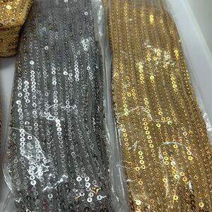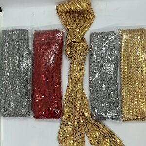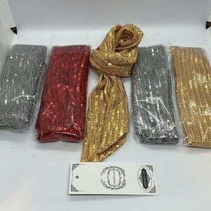 5 New Shimmering gold sequin scarf’s. Includes gold,red, and silver Perfect for adding sparkle to any outfit. $20 for all