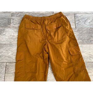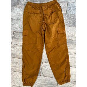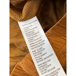 Good American Essential Cargo Pants size 1 Nylon joggers Womens Shine Brown bronze / gold in color, 100% Nylon and lined of 100% Polyester. Elastic cuffs / jogger pant. Elastic and drawstring waist. Two front pockets, cargo side pocket, two back snap close pockets. Hand wash. Inseam 29", leg opening 5", waist 14.5" laying flat across, rise 11.5". There is a mark / scratch about 16.5" down on the back right side as pictured. No other rips or stains. perfect for the business casual yoga pants relaxed comfort walking business casual office lady.