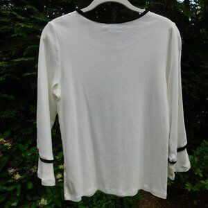 Rafaella cream-color stretchy rib-knit bell-sleeve embellished top with contrast black trim