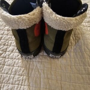 Stylish high-top sneakers. Olive green canvas with black accents. Red logo patch. Comfortable and durable.