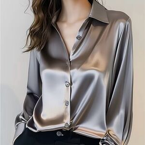 Shine in this elegant silver satin blouse, perfect for any occasion. Its sleek design offers a sophisticated look.