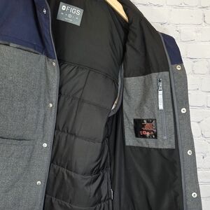 Modern vest with gray body and blue shoulders. Perfect for layering.