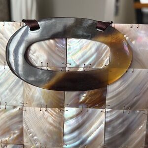 This stunning clutch features a beautiful mother of pearl design, perfect for adding a touch of elegance to any outfit. The unique handle adds a sophisticated touch.