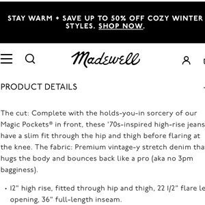 On sale now on Madewell’s site for $68, originally $128. Only worn about 5 times, in like-new condition. So cute, versatile and comfy. I am better in a mid-rise jean due to my shorter torso. :-) Love these but find them a bit too high/waisted for me so am not reaching for them as often. Great jeans for every day, comfy and have a decent amount to stretch (perfect for bloated days or big meals!), without looking like “stretch” jeans). I think they look and feel like legit 100% cotton jeans, but with the advantage and comfort of having stretch. Hard to find that’s combo in a pair of jeans!