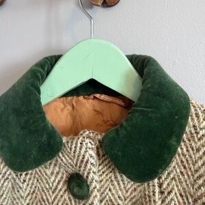 Classic Grandmillennial & Cottagecore aesthetic. Features a herringbone weave, forest green velvet Peter Pan collar, buttons, and pocket trim. Beautiful A-line silhouette.