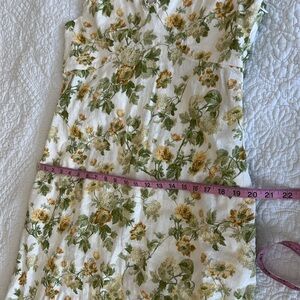 Charming sleeveless dress with a floral pattern. Features a mix of green and yellow flowers on a white background.