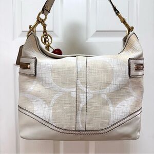 A classic vintage Coach hobo in signature linen canvas, designed with a spacious interior and an easy shoulder carry, finished in a light neutral palette ideal for warmer months.