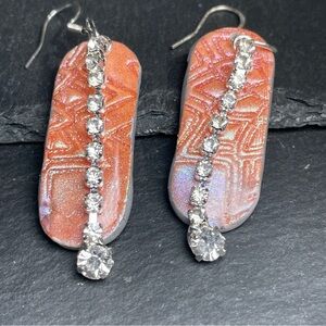 Add a touch of Shimmery elegance with these Beautiful Handmade Dangly Crystal Rhinestones Earrings Dropped Against A Hand Crafted Polymer Clay Embossed Base Sealed In Clear Resin Featuring Color Changing Mica Powders