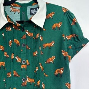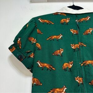 hell bunny dress, fox print dress, green retro dress, novelty print dress, vintage inspired dress, 1960s style dress, fit and flare dress, short sleeve retro dress, size medium dress, uk 12 dress, cottagecore dress, whimsical animal print, fall retro outfit, playful statement dress