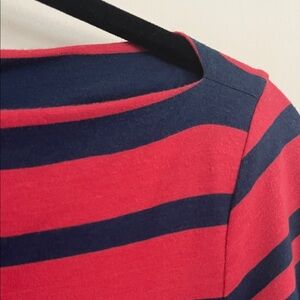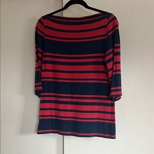 Chic top with bold navy and pink stripes. Perfect for casual outings. Boatneck. 3/4 sleeve.