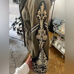 Stylish olive green jacket with intricate embroidery. Perfect for adding a touch of elegance to your wardrobe. Worn twice and perfect condition. A true masterpiece!