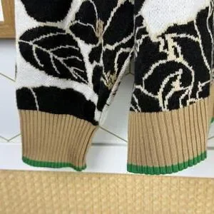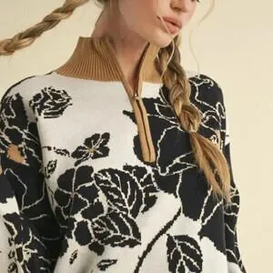 Stay warm and stylish with this cozy pullover sweater featuring a bold black and tan floral pattern on a cream background. The zip collar adds versatility, allowing you to wear it open or closed for comfort. Ribbed cuffs and hem with subtle green accents provide a nice finishing touch. Perfect for casual outings or layering on cooler days.