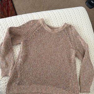 Chic knit sweater with a classic crew neck. Ideal for layering in cooler weather. Tan multi colored sweater tan, cream, purple, and gray hues in the color way.