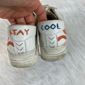 Stylish white sneakers featuring a vibrant sun design with blue, orange, and yellow accents. Perfect for adding a pop of color to any outfit.