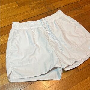 This is the women’s Alo Yoga Alumni Shorts in white. These are a high rise, loose fitting pair of athletic or running shorts. Made of a lightweight performance fabric blend, these have a drawstring waist, front hand pockets and the brand logo on the side. Good shorts for any fitness activities and much more!