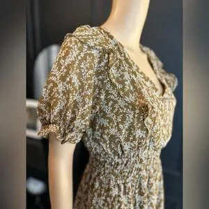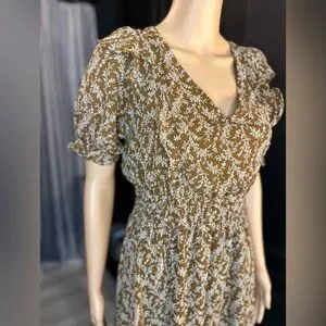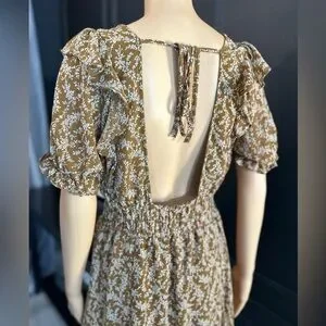 Chic and comfortable floral brown dress perfect for any occasion. Features a flattering V-neck and an open back with lace ties and smocked waist