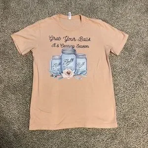Fun peach tee with a playful canning graphic. Ideal for casual wear.