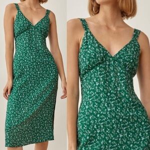 Elegant emerald midi dress with floral design. V-neckline and side slit. Ideal for versatile styling.
