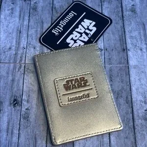 Elegant gold card holder with Star Wars and Loungefly logos. Perfect for fans.