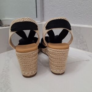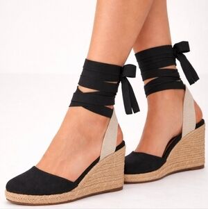 Kelly And Katie Black Espadrille Wedge Sandals with Wraparound Ankle Tie Bow
