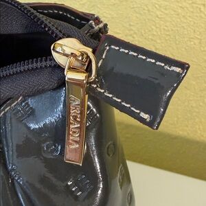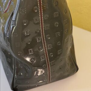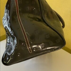 Chic satchel in glossy greenish color Features gold hardware and embossed design. Perfect for elevating any outfit. No strap. Callouts on corner and black mark on bottom. Some scratches on front hardware. Big and Roomy. Inside is clean. Zipper works good. Please see pictures for references. So Nice bag otherwise. Love offers.