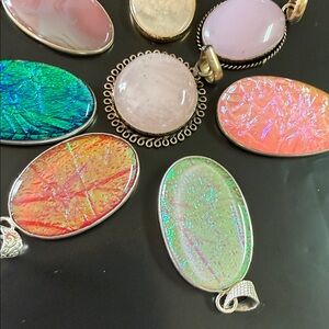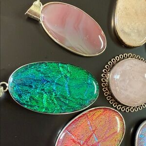 Set of eight vibrant gemstone pendants. Features pink, orange, green, and purple stones. Perfect for jewelry making or as unique accessories.
