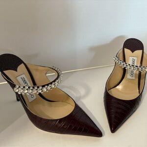 Chic burgundy heels with crystal embellishments. Perfect for adding glamour to any outfit.