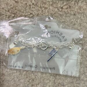 Chic silver bracelet with playful charms. Features vibrant lipstick, hairdryer, and ball designs. Perfect for adding flair.