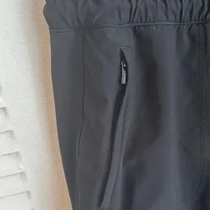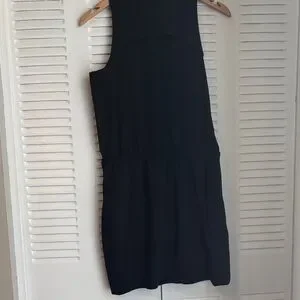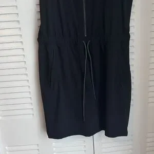 Sleek black jumpsuit. Sleeveless design. Front zipper detail. Drawstring waist for comfort.