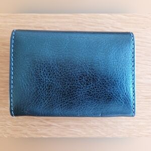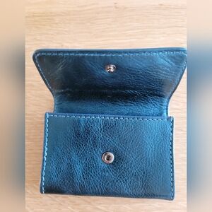 Authentic Marc by Marc Jacobs cow leather wallet in a rich blue-teal shade with subtle metallic undertones. Crafted from soft pebbled leather, this compact wallet has a clean, minimalist interior layout. A stylish and practical designer wallet — ideal for coins, folded bills, or small essentials.