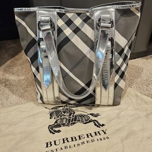Authentic silver/black Burberry tote. Made of nylon with silver leather details.