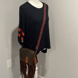 Stylish Louis Vuitton crossbody bag. Features brown monogram design. Tan leather accents. Fringe detailing adds flair.