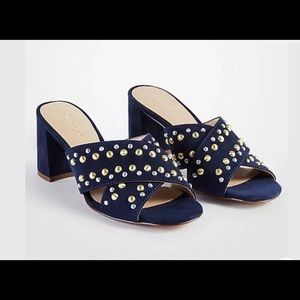 Embellished with bright and shiny studs in gold and silver, our rich suede sandals polish your look from head to toe. Open toe. Padded footbed for complete comfort. Covered 2 1/2" heel. Navy blue. Gold and silver studs. Size 8.5. New in box!