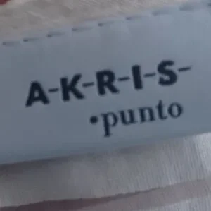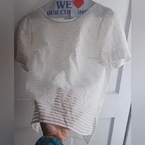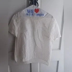 Size 8 Akris Punto white tee in alternating horizontal strips of sheer and opaque fabric. Shoulders measure 15 inches across, chest measures 18 inches armpit to armpit seam, overall length is 22 inches in front, and 24 inches in back. Inverted pleat in back, bottom side vents. Material is 77% viscose, 23% polyamid. Dryclean only, fabric is from Italy. A few rumples from storage; otherwise, in excellent pre-owned condition.
