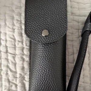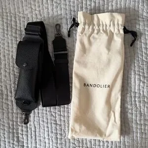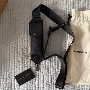 Elegant black sunglasses holder strap for phone case by Bandolier. Comes with a cream drawstring pouch. Perfect for hands-free convenience.