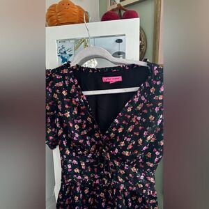 Elegant black dress featuring vibrant pink floral accents. Stylish and versatile.
