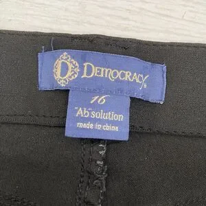 Democracy Pants "Ab"Solution Black Stretch Skinny Jeans Womens Size 16 Classic. Democracy womens "ab"solution jeans. Zipper and button closure. Five pocket design. Skinny fit. Cotton, polyester and spandex fabric. Stretchy. Black. Size 16. Measured laying flat: 18 inches at waist, 11.25 inch rise, 28 inch inseam.
