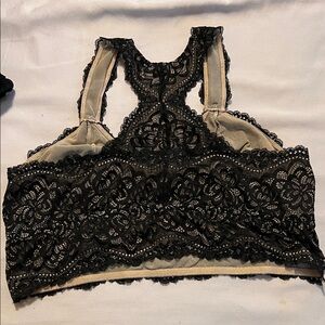 Elegant black lace bralette with intricate floral patterns. Perfect for layering or wearing alone.