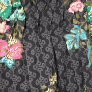 Stylish navy blouse with floral design. Features ruffle sleeves and vibrant patterns.