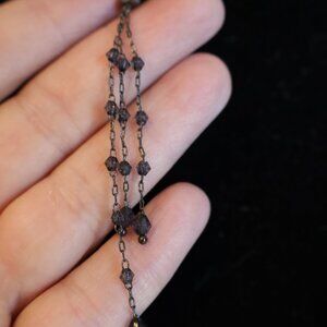 This is so dainty and pretty the way it hangs. The chain is black and the crystals are blue. it is a little worn but the tag says 1928 C. It is 14.5" w extender to 17"