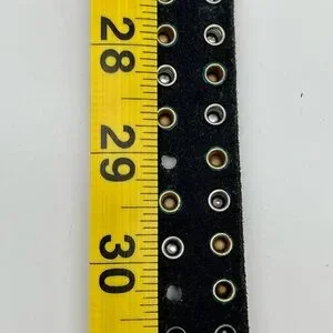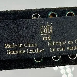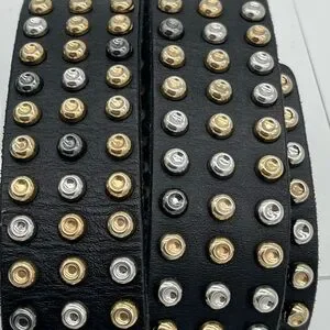 Stylish black leather belt with gold, steele gray, and silver color studs. In excellent condition. No studs missing.
