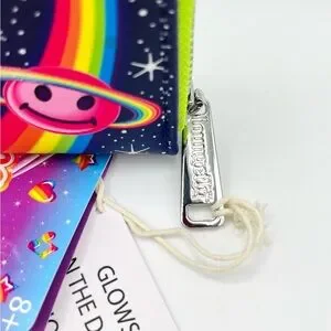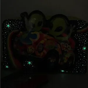 Lisa Frank Cosmic Alien Ride Zip Around Wallet, glow in the dark. Featuring the characters Zoomer and Zorbit in a psychedelic car that travels through a cosmic, star-filled background.