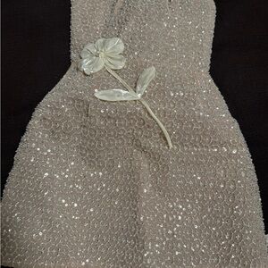 This chic strapless dress in a soft pink hue features a beautiful floral accent. Ideal for special occasions, it combines elegance with a modern touch.