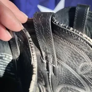 Classic black leather boots with detailed stitching. Ideal for Western style.*does have some wear along edging at top & side piping, otherwise, in good shape. Not worn much, just been in storage.
