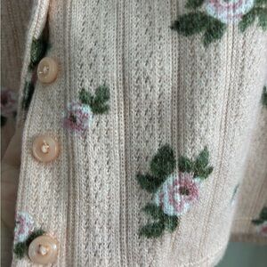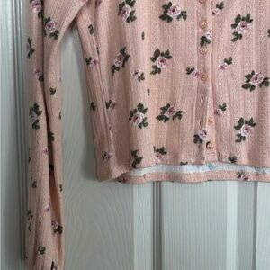 Cottagecore pink cardigan with floral pattern. Features long sleeves and button-up front. Super soft cloud material from Lucky. Gorgeous floral pointelle knit. This is a gorgeous spring top for the cottagecore look or for the barbiecore aesthetic. Coquette spring top. Trendy button front pink top.