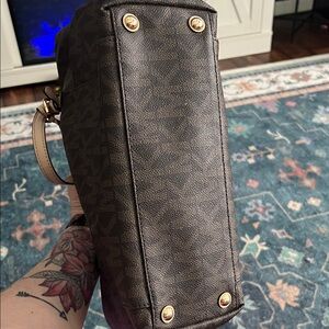 Stylish brown monogram tote bag perfect for everyday use. Features a spacious interior and durable handles. Signs of wear on inside especially by zipper shown in photos