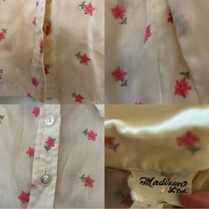 60s / early 1970s cream button-down diamond collar blouse with pink rose pattern - stained