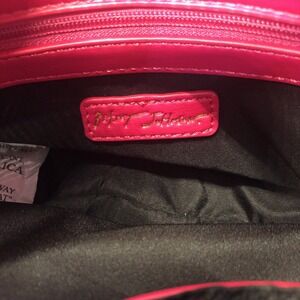 This Betsey Johnson crossbody bag features a hot pink exterior with a beautiful quilted heart pattern design. The bag has a magnetic and snap closure, with a gold and pink color scheme for the handles and strap. The bag is small in size, measuring 8.59" in width, 6.75" in height, and 3.95" in depth, and has a crossbody strap with a 24" drop.