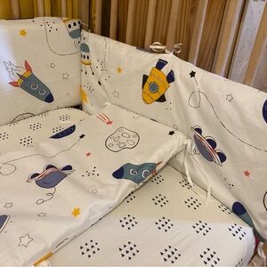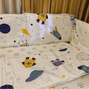 Space theme toddler crib liner set with removable/washable cotton covers that tie onto the crib slats. Thin foam inside for slightly cushioning. Fun print with rockets, space ships, moons, and stars. Fits a standard size crib. Lightly (barely) used, in like new condition.