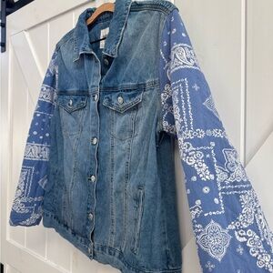 Classic denim trucker jacket featuring quilted bandana-print sleeves. A standout layering piece that elevates everyday outfits without feeling bulky. Easy to throw on over tees, tanks, or hoodies for an effortless western-boho look. Rarely seen in standard denim jackets!